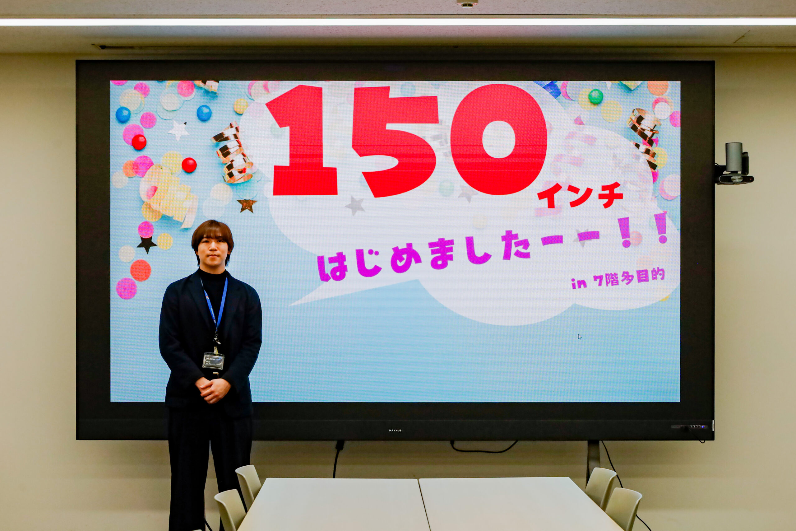 多目的ホールは、名前の通り限定的な使い方をしない部屋で、大きなディスプレイを使いたいシーンでは社内外問わず使用します。