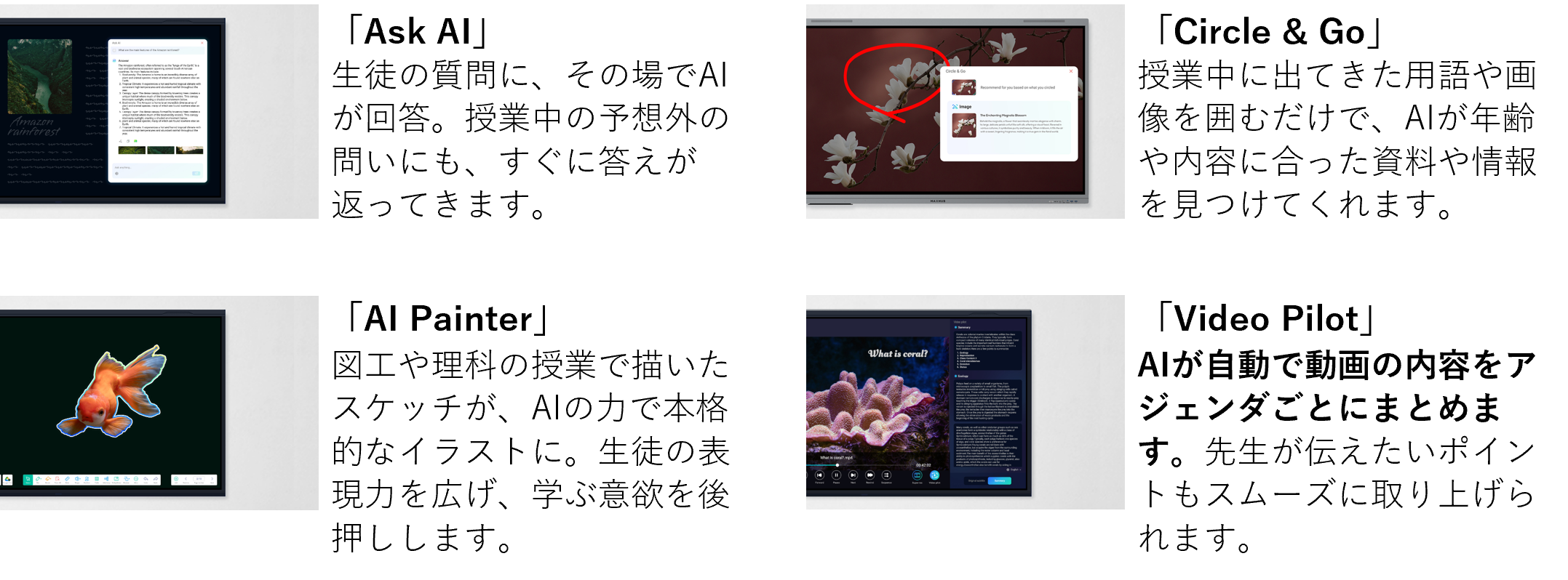 また、ペアモードなどグループワークに適した機能や、画面に書き込んだ文字の検索など便利な機能を多数搭載。