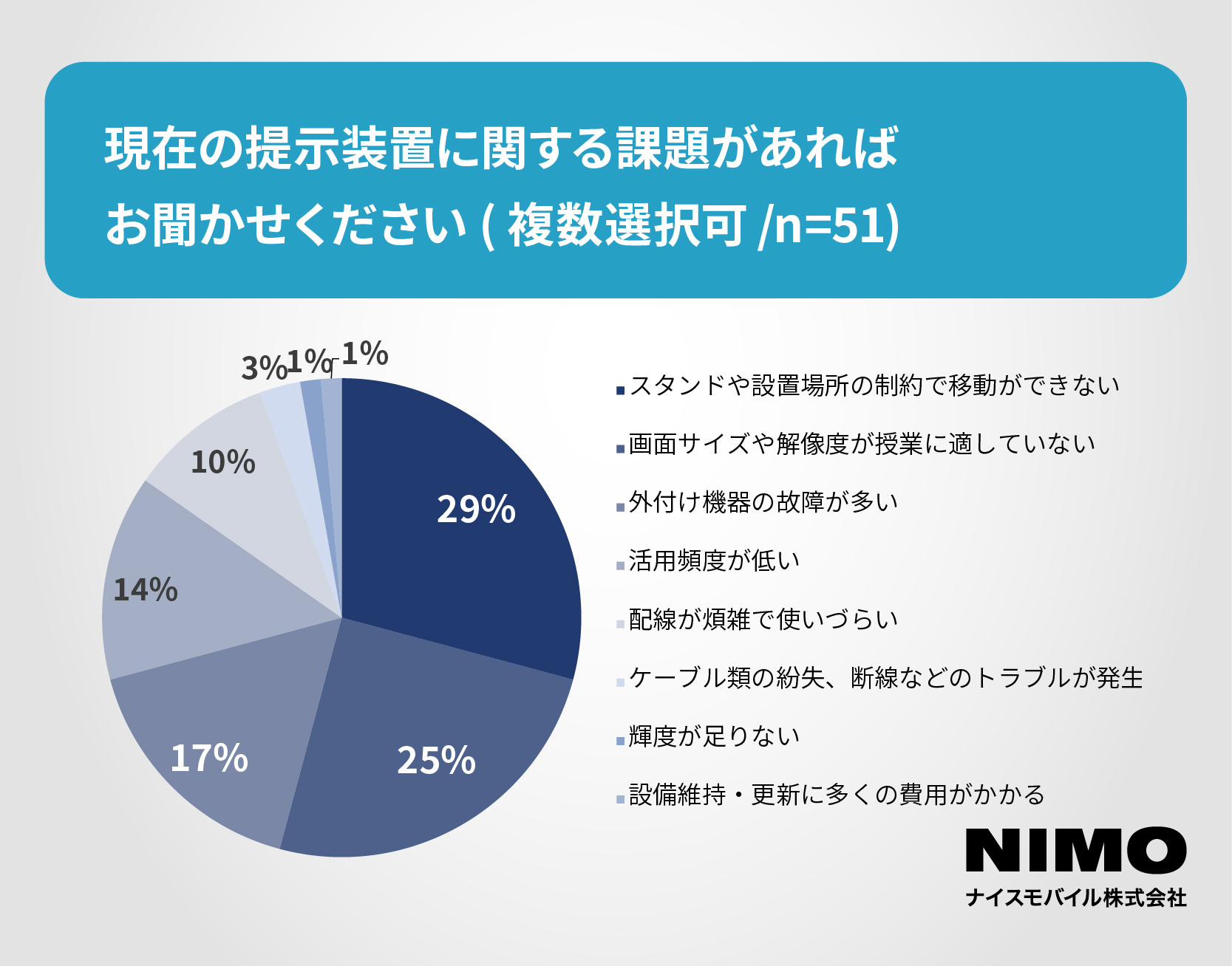 現在使用している大型提示装置に関する課題について、複数選択式で調査を行ったところ、「スタンドや設置場所の制約で移動ができない」が最も多く、